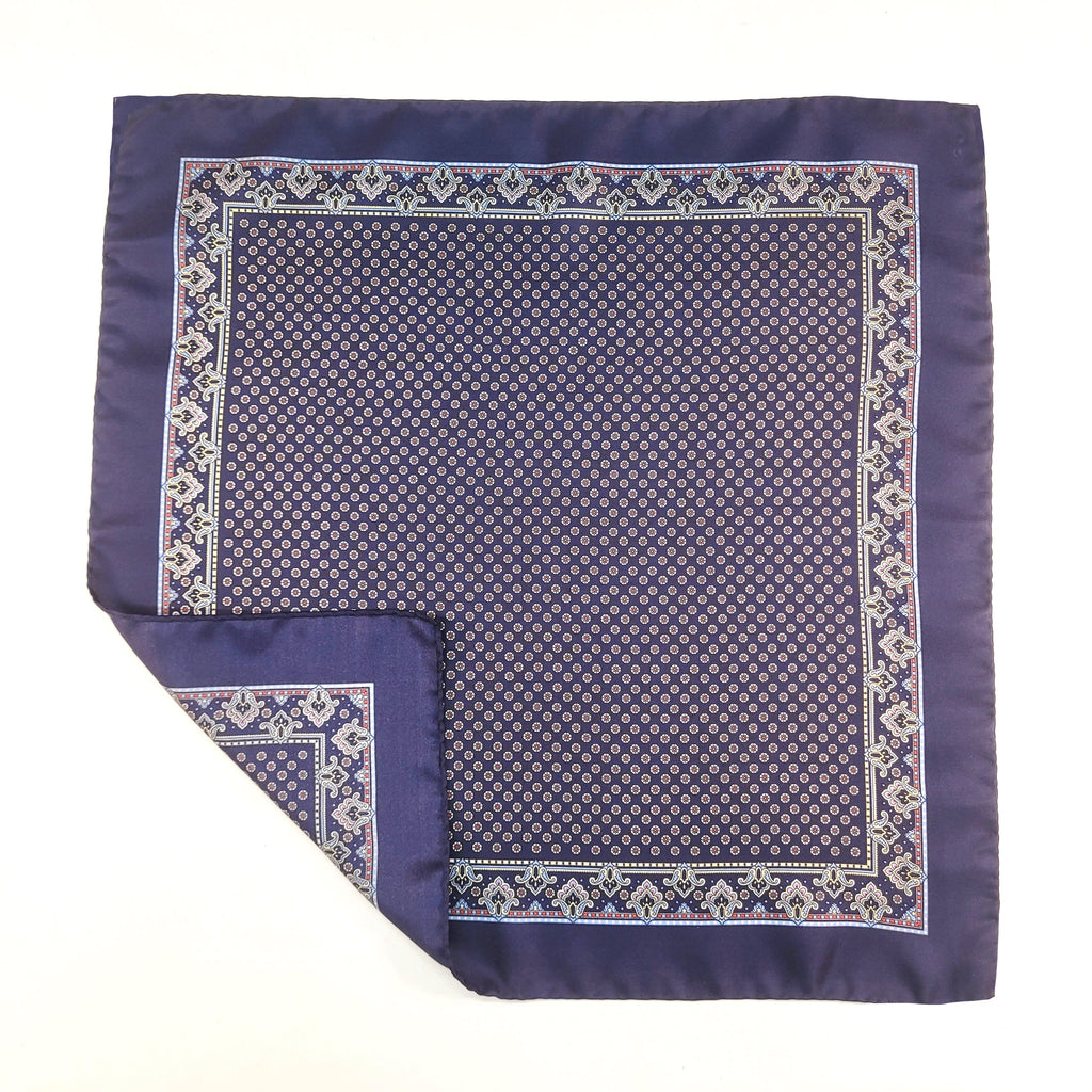 Navy and Red Circle Geometric Silk Pocket Square with a Paisley border