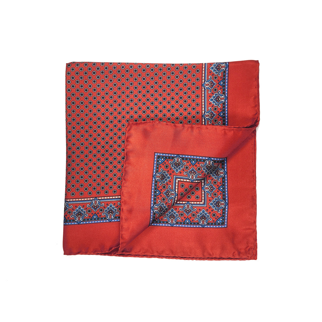 Deep Red and Blue Circle Geometric Silk Pocket Square with a Paisley border