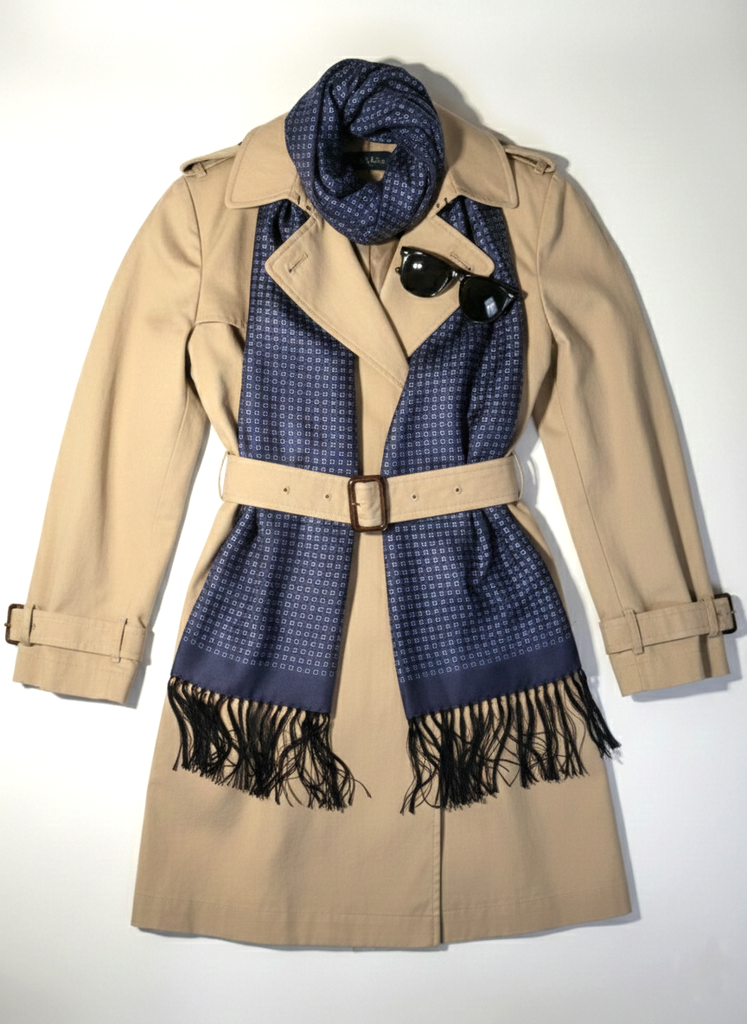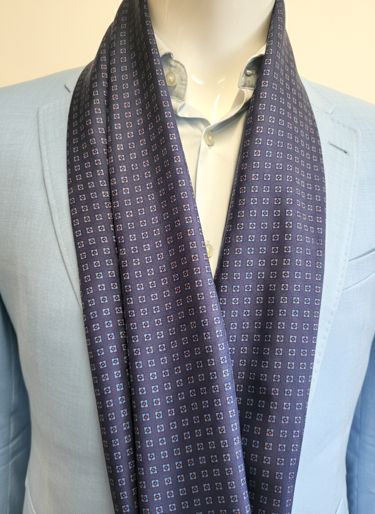 Navy and Light Blue Geometric Silk Scarf with Hand Knotted Navy Tassels