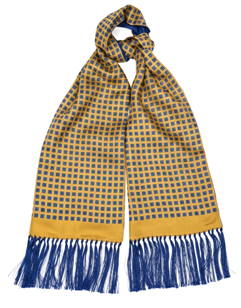 Mustard Gold Silk Scarf with Hand Knotted Blue Tassels