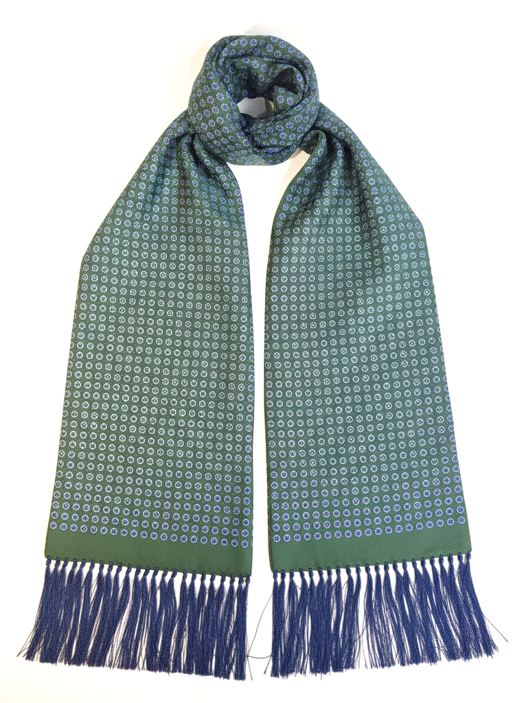 Green Silk Scarf with Hand Knotted Navy Tassels