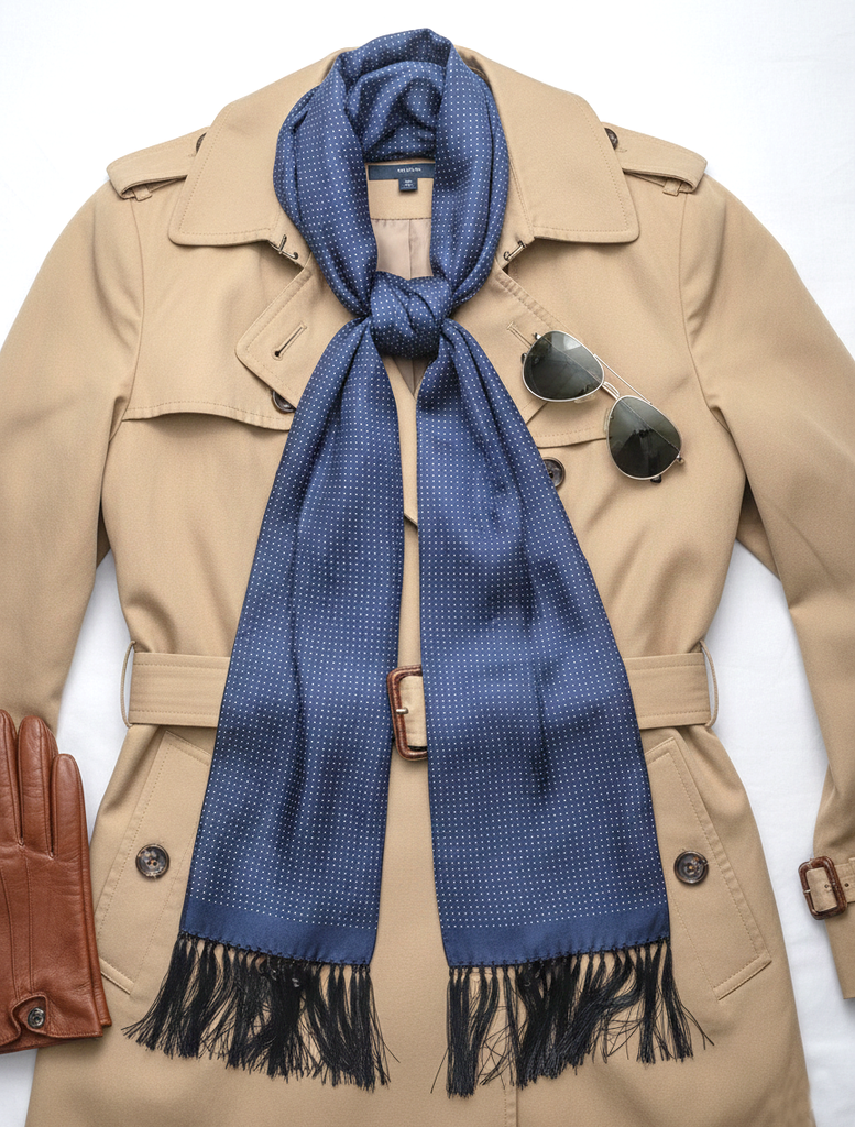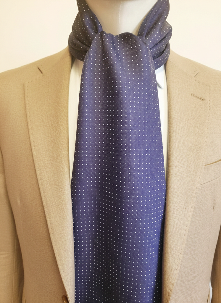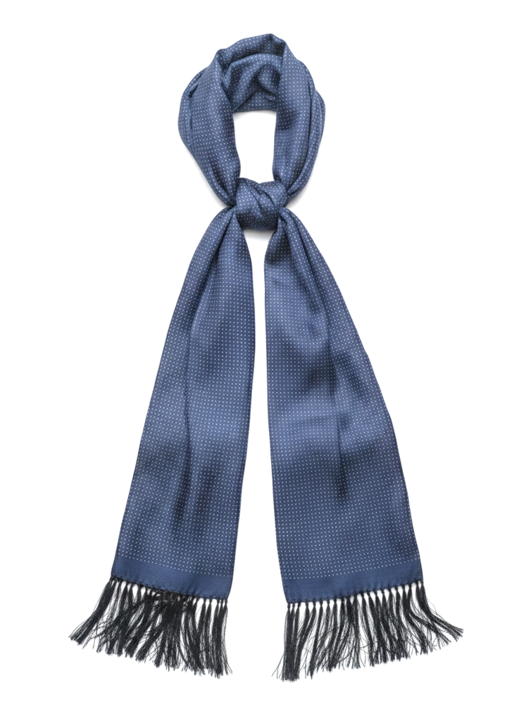 Navy & White Polka Dot Silk Scarf with Navy Tassels Hand Knotted